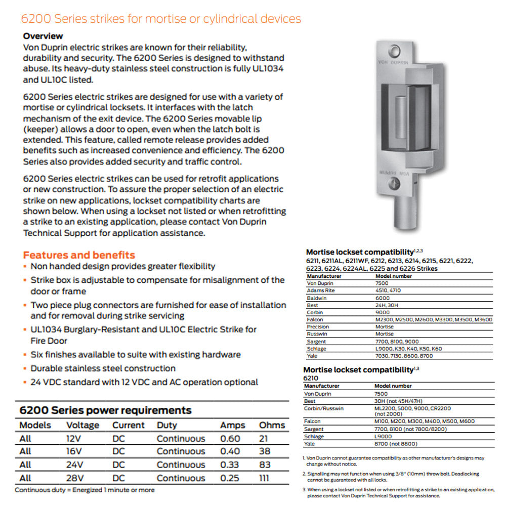 The 6200 Series is designed to accommodate a wide range of cylindrical and mortise locksets, including compatibility with mortise exit devices. These electric strikes work seamlessly with doors outfitted with Von Duprin, Schlage, Falcon, and many other manufacturers’ hardware. Choose from 17 model configurations to match virtually any application—whether your project involves interior or exterior doors with hollow metal, aluminum, or wood frames.