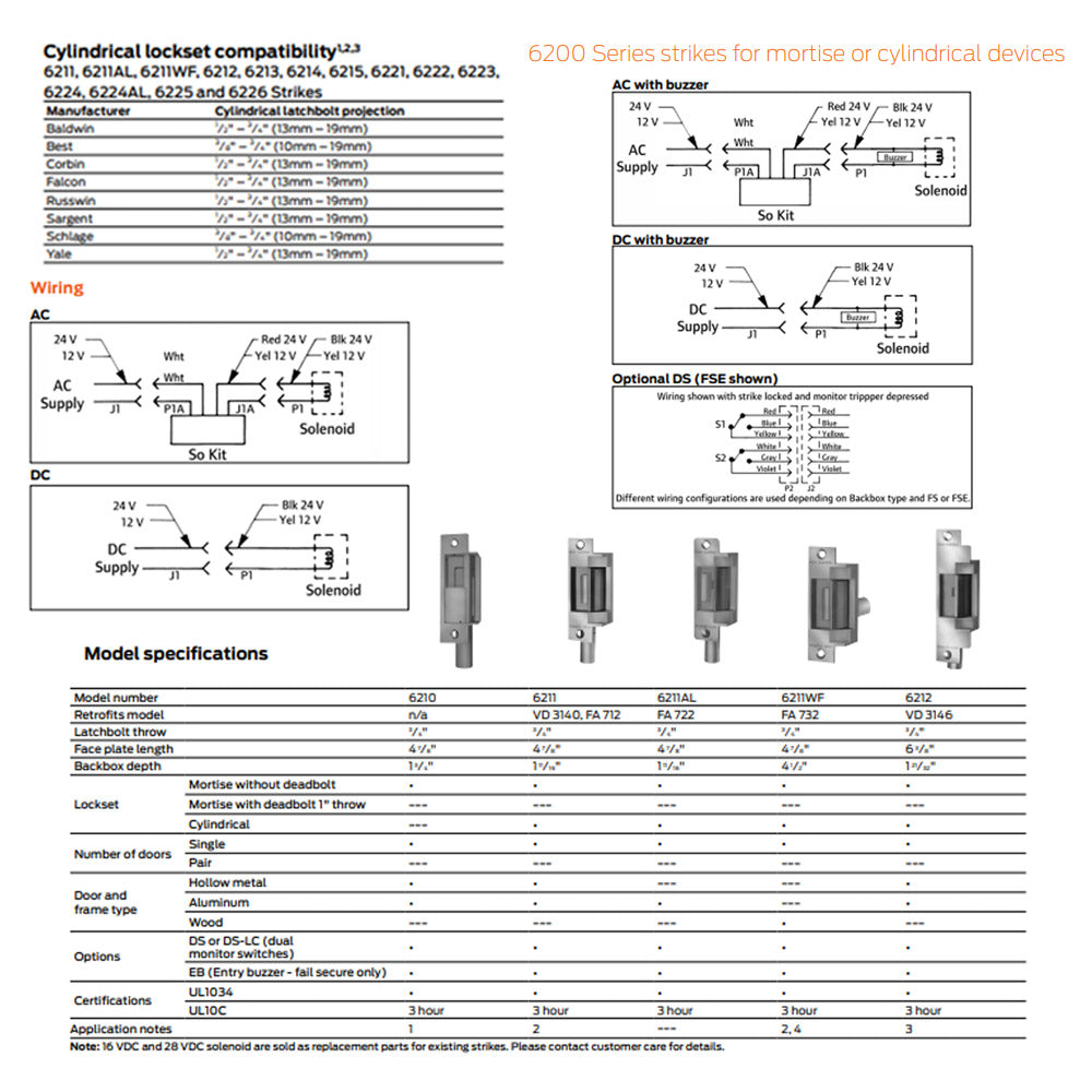 The 6200 Series is designed to accommodate a wide range of cylindrical and mortise locksets, including compatibility with mortise exit devices. These electric strikes work seamlessly with doors outfitted with Von Duprin, Schlage, Falcon, and many other manufacturers’ hardware. Choose from 17 model configurations to match virtually any application—whether your project involves interior or exterior doors with hollow metal, aluminum, or wood frames.