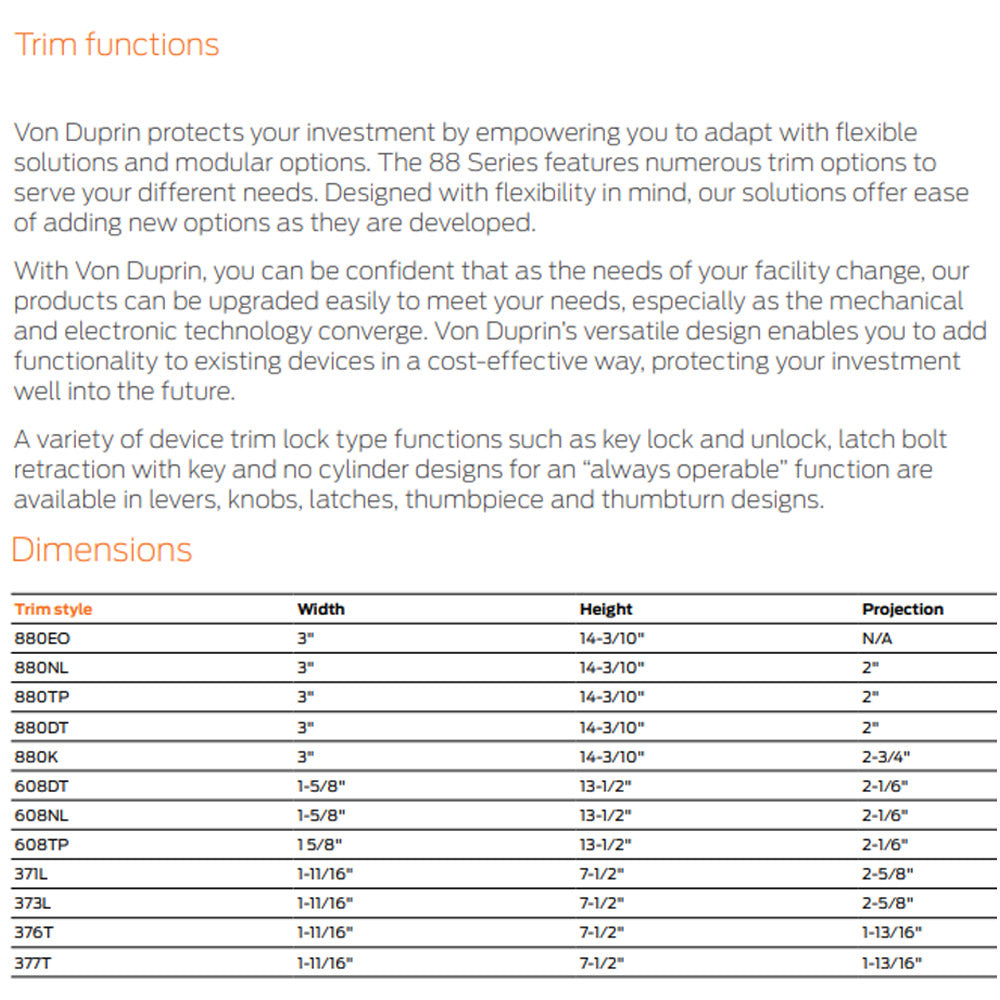 The Von Duprin 88 Series is a timeless crossbar-style exit device, designed to deliver both functionality and a classic aesthetic. As a wide stile device, it is ideal for facilities seeking traditional appeal without compromising on performance or code compliance.