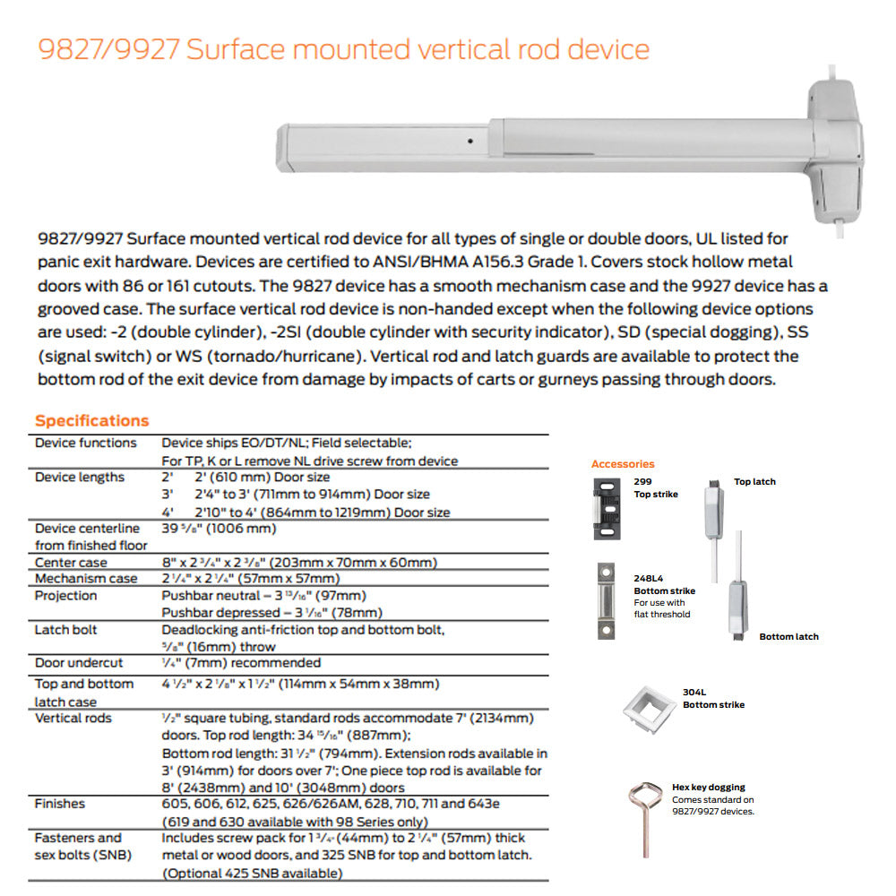 The 9827/9927 Series has been certified to the highest industry standards and are used in schools, hospitals, and government buildings. Surface mounted vertical rod device for all types of single or double doors, UL listed for panic exit hardware. Devices are ANSI A156.3 – 2014 Grade 1. Covers stock hollow metal doors with 86 or 161 cutouts. The 9827-F model is fire-rated for pairs of doors up to 8′ x 10′ – UL listed for fire exit hardware.
