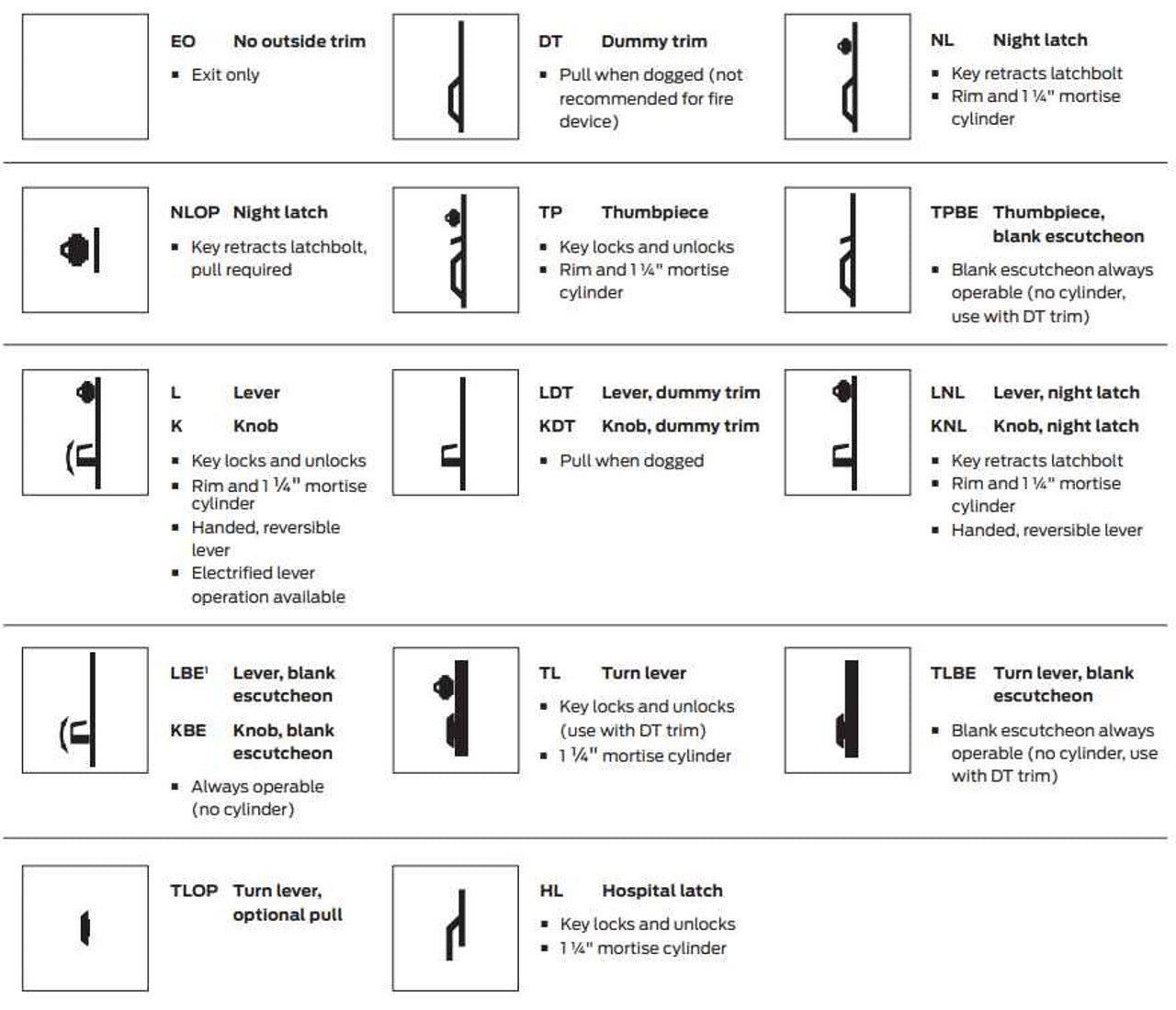 - -2/-2SI: Double cylinder (-2) or double cylinder with security indicator (-2SI), allows users to lock the outside trim from inside the room, while still allowing free egress.