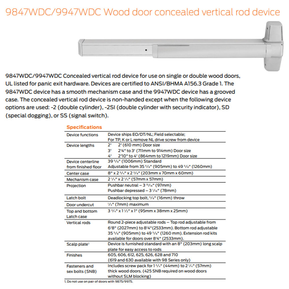 Von Duprin 9847WDC-NL/9947WDC-NL - Night Latch Wood Door Concealed Vertical Rod Device