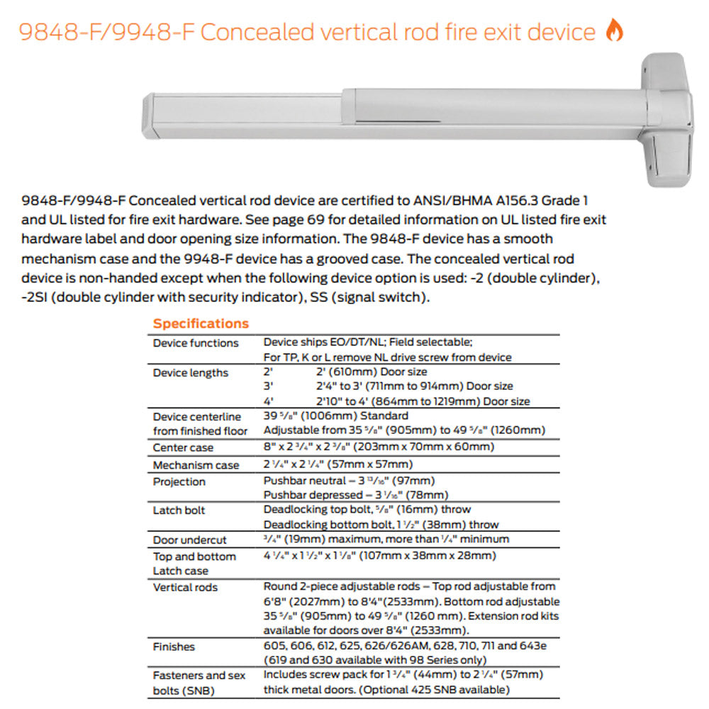 Designed for use on single or double metal doors, the 9848/9948 series concealed vertical rod devices offer reliable and secure panic exit solutions. These UL-listed devices meet stringent safety standards, certified to ANSI/BHMA A156.3, Grade 1, ensuring top-tier performance and durability.