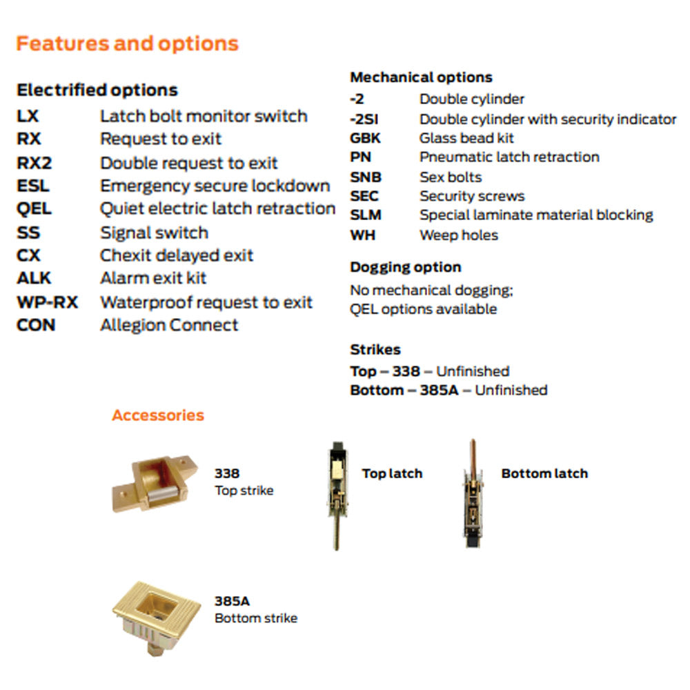 - -2/-2SI: Double cylinder (-2) or double cylinder with security indicator (-2SI), allows users to lock the outside trim from inside the room, while still allowing free egress.