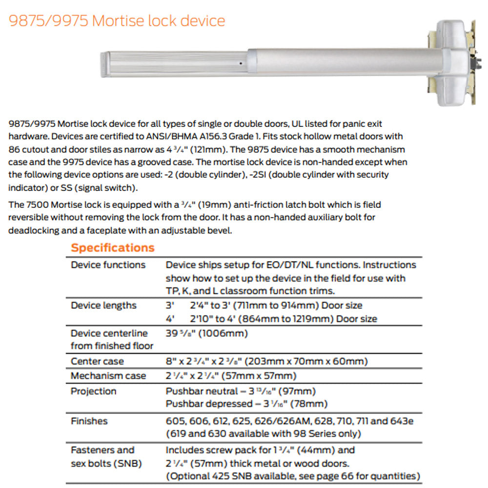 The Von Duprin 9875 and 9975 mortise lock exit devices are designed for single or double doors, offering reliable security with UL listing for panic exit hardware. Built to meet ANSI A156.3-2001 Grade 1 standards, these devices ensure top-level durability and performance.