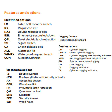 • -2/-2SI: Double cylinder (-2) or double cylinder with security indicator (-2SI), allows users to lock the outside trim from inside the room, while still allowing free egress.
