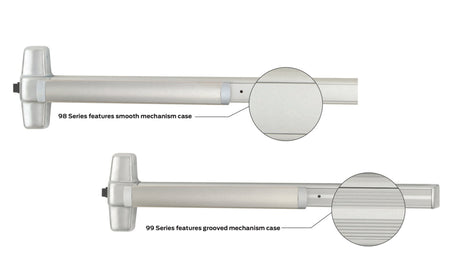 Architectural design elements differ between the 98 and the 99. The 98 Series device has a smooth mechanism case, while the 99 Series has a grooved mechanism case.