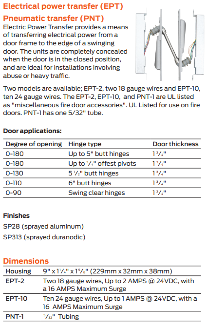 Electronic power transfers (EPT) provide a wiring path from the door to the frame, allowing products on or around the door to receive power as well as monitoring door status.