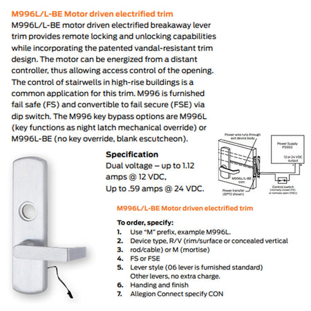 Von Duprin M996L-M - Motorized Lever Trim for Mortise Lock 98/99 Series Exit Devices