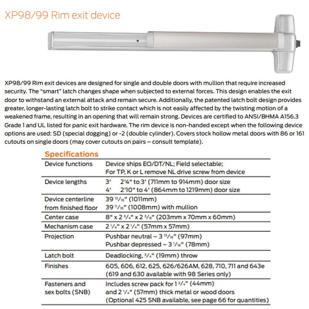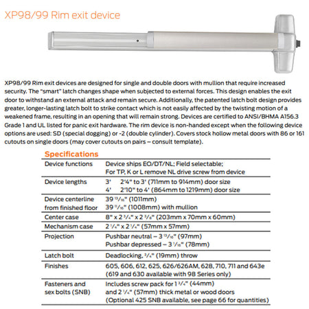 Built with a modular architecture, the XP98/XP99 Series can be upgraded to meet evolving security needs and technologies. Suitable for both single and double doors with mullions, it is UL listed as Panic Exit Hardware for added assurance.